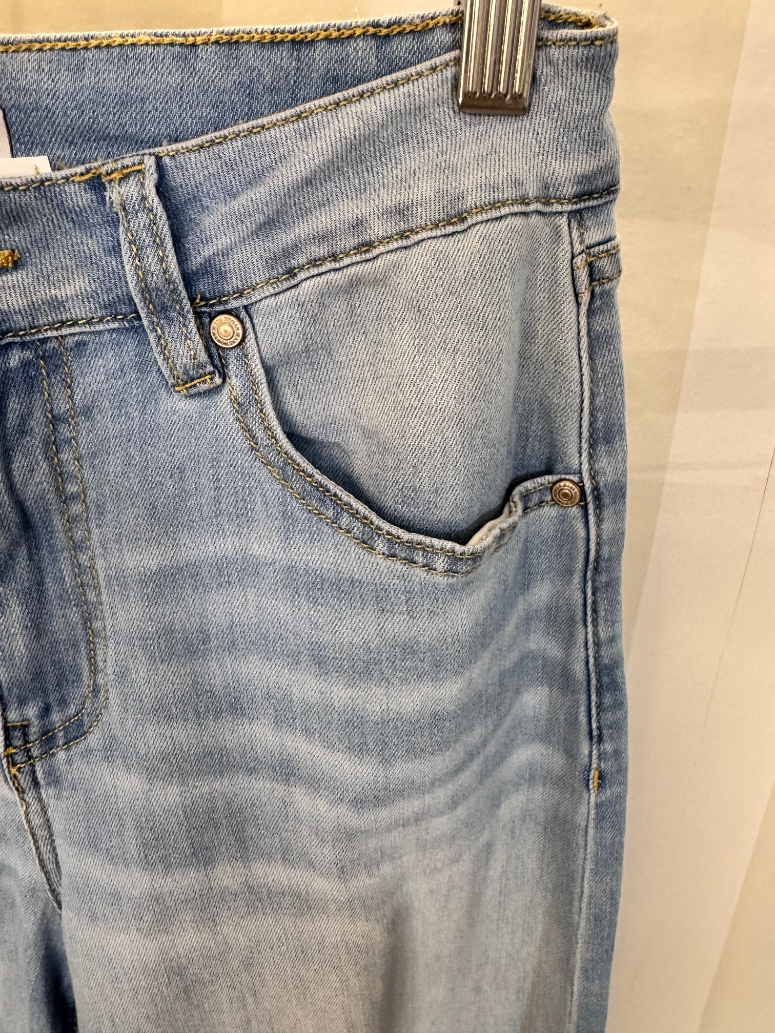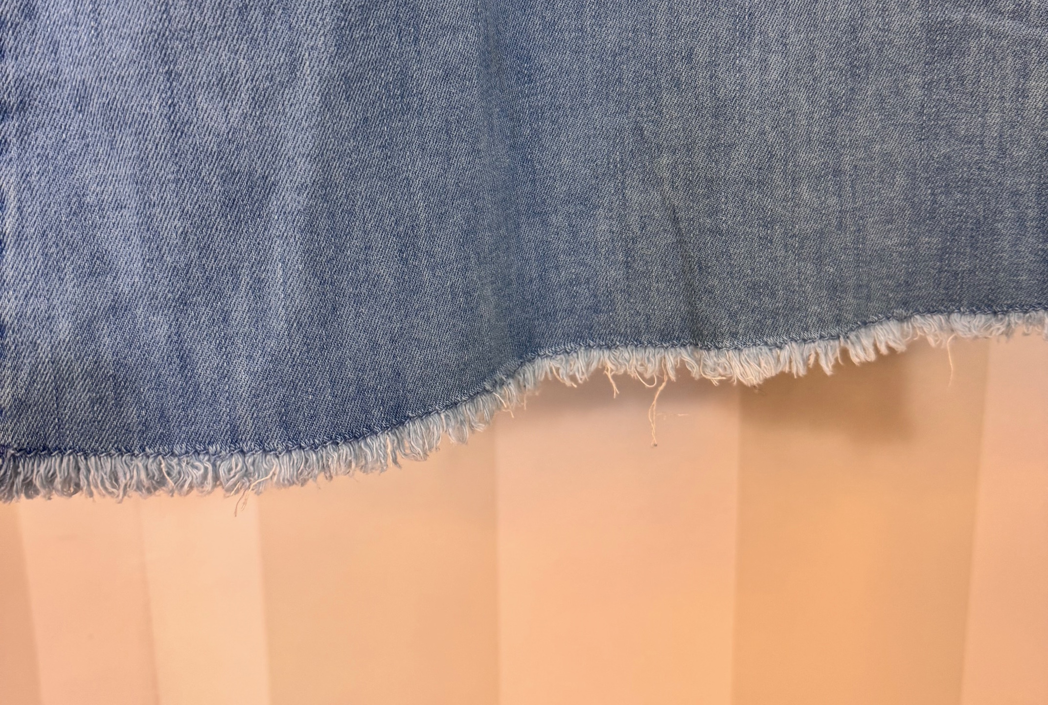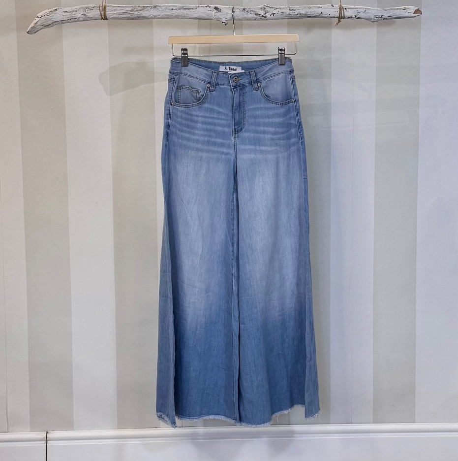Pantalón extra ancho que queda cogido en la parte superior y se ensancha de manera maxi a partir de l cadera. Género fino. Parte inferior deshilachada.