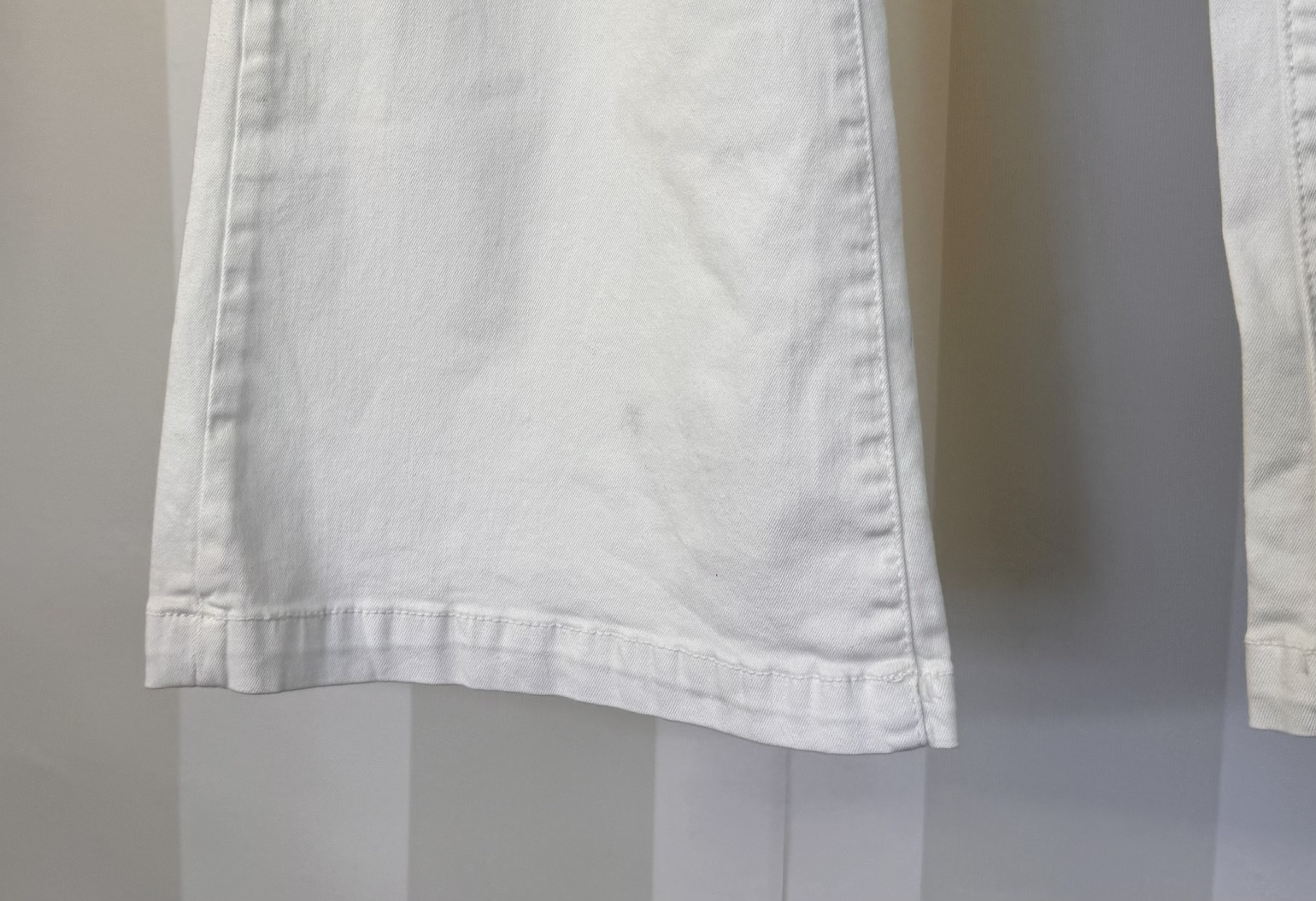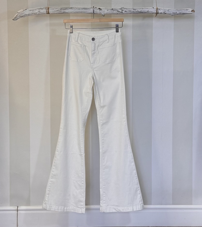 Pantalón flare de grosor medio fino. Ajustado de pierna y poco acampanado en la parte inferior.