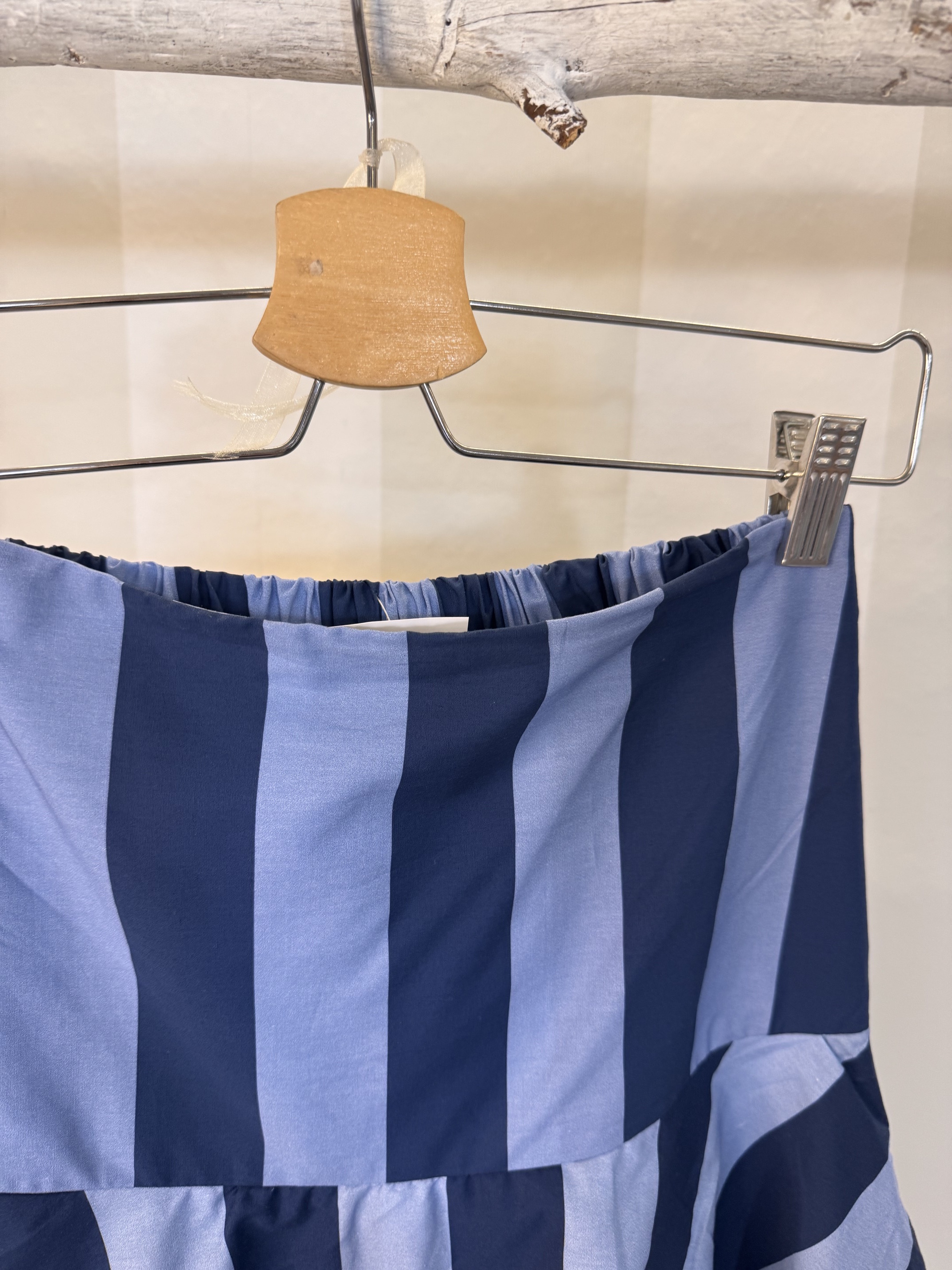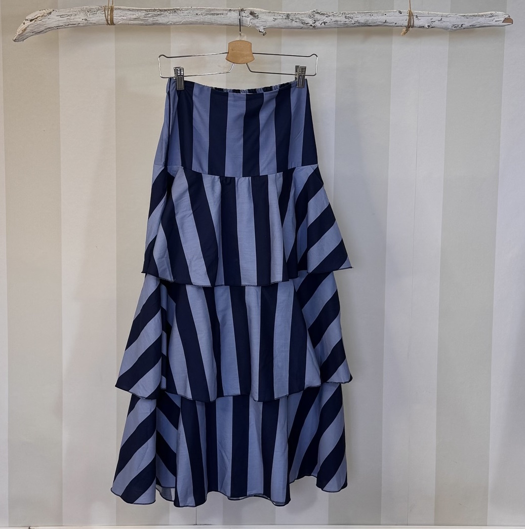 Falda de rayas con volantes. Talla única con goma en parte trasera de cintura. Ligera forma evasé.