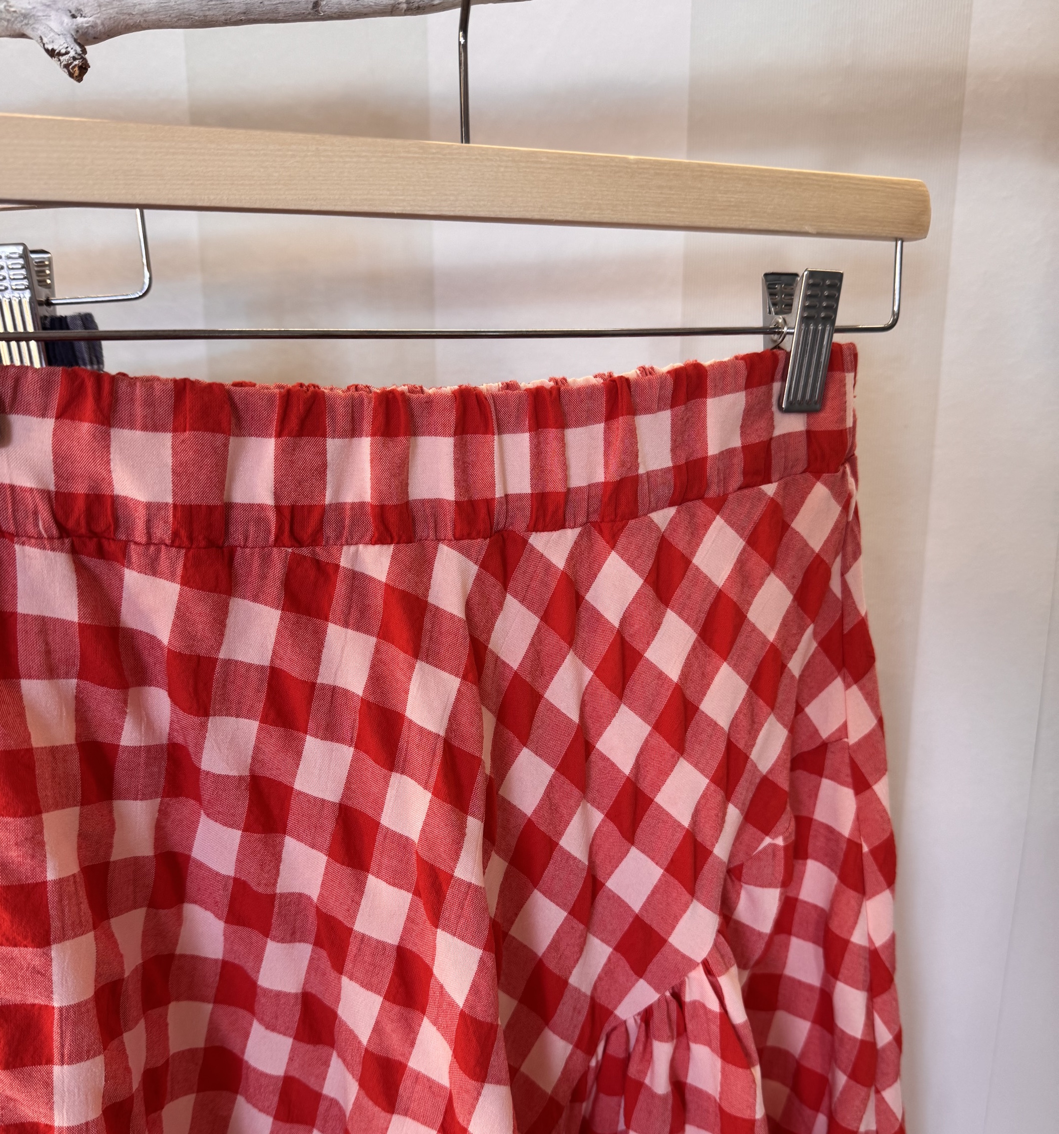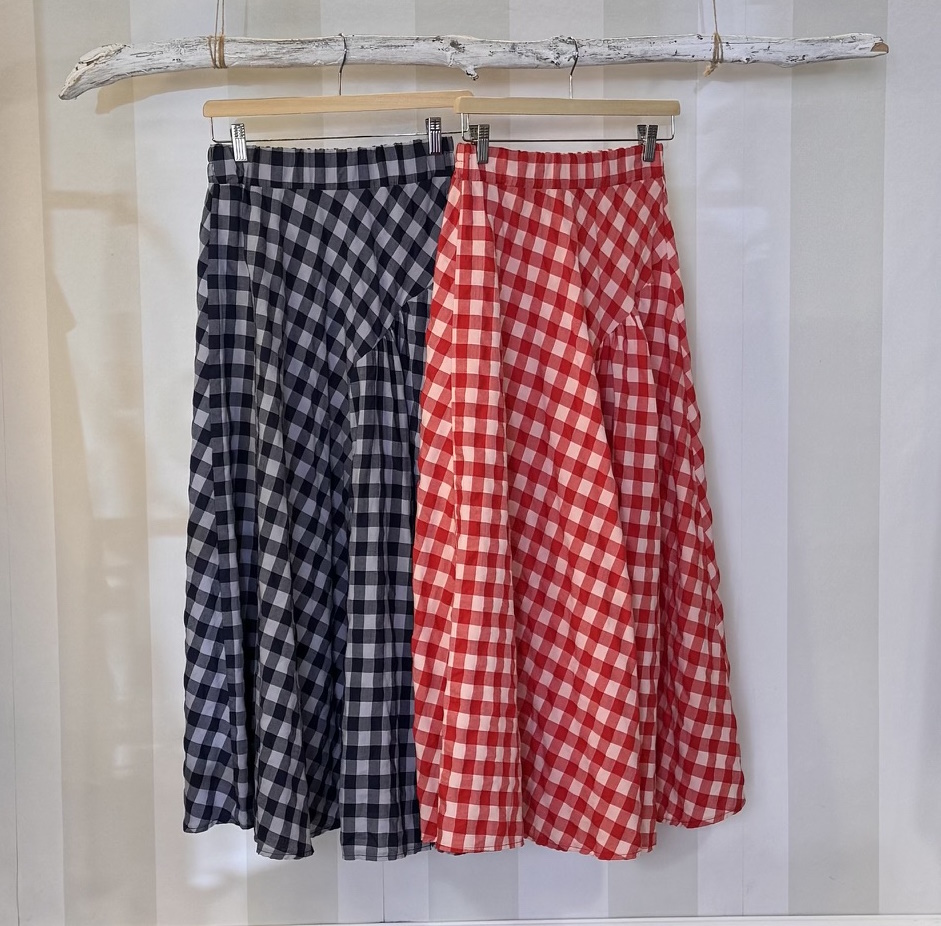 Falda evasé de cuadros vichy medianos. Cintura elástica. Talla única.