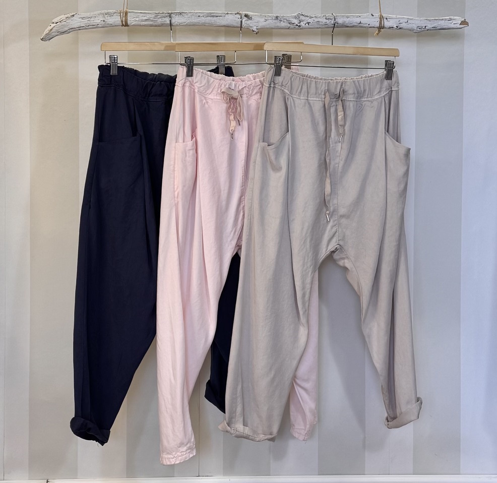 Pantalón baggy (cagado) de tela con bolsillos traseros. Cintura de goma ajustable. Talla única.