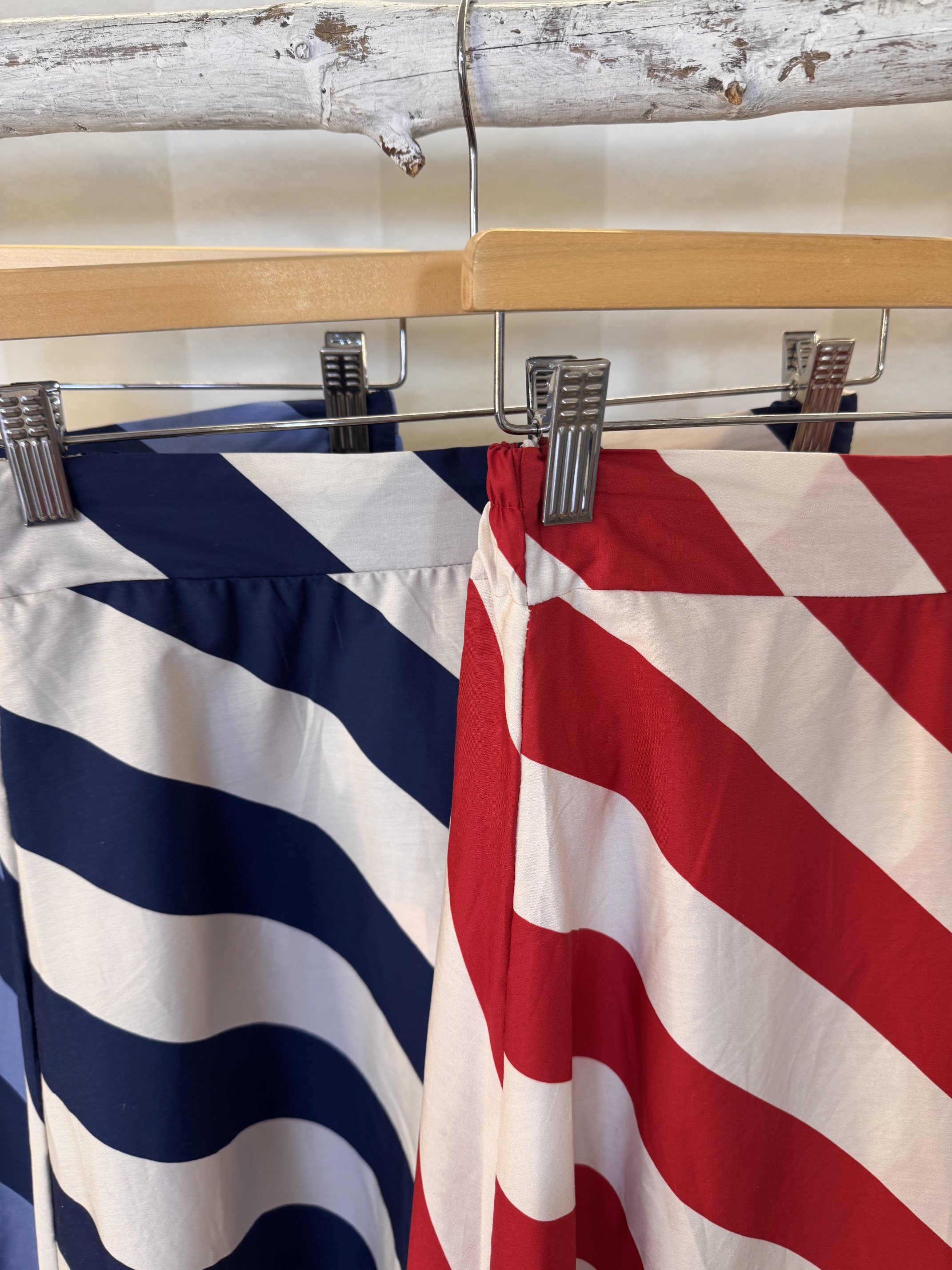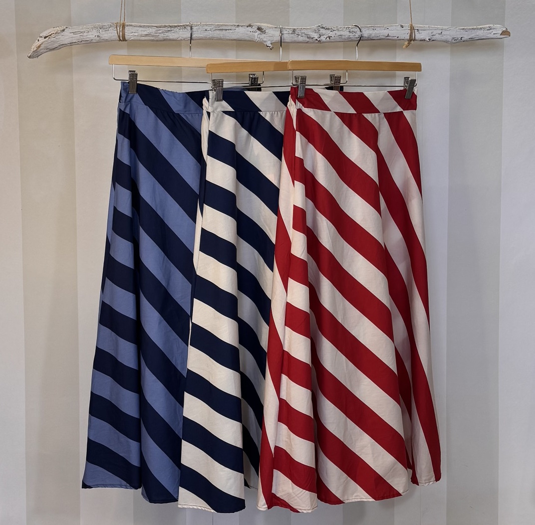Falda de rayas con forma evasé. Talla única con goma en la parte trasera de la cintura.
