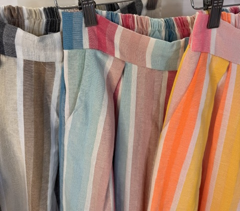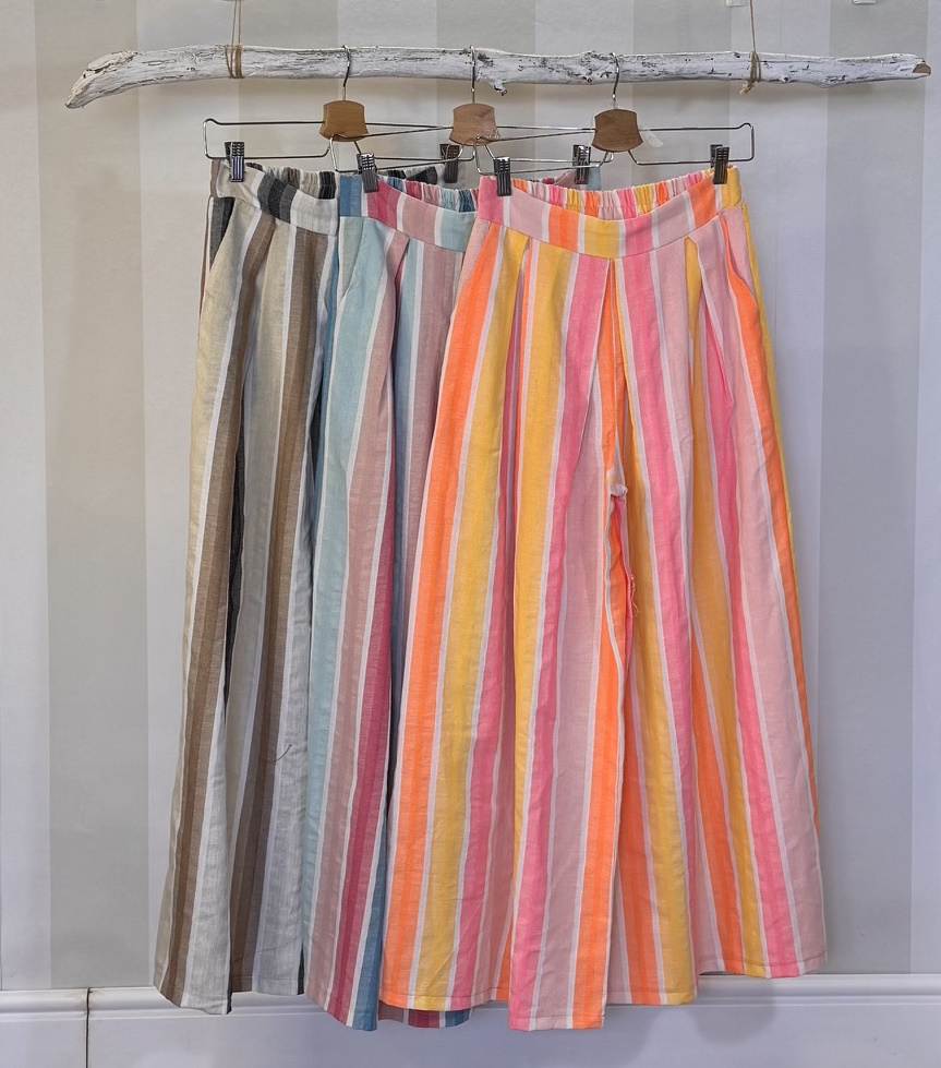 Pantalón de rayas con pinzas. Parte trasera de cintura con goma ajustable. Talla única completa.