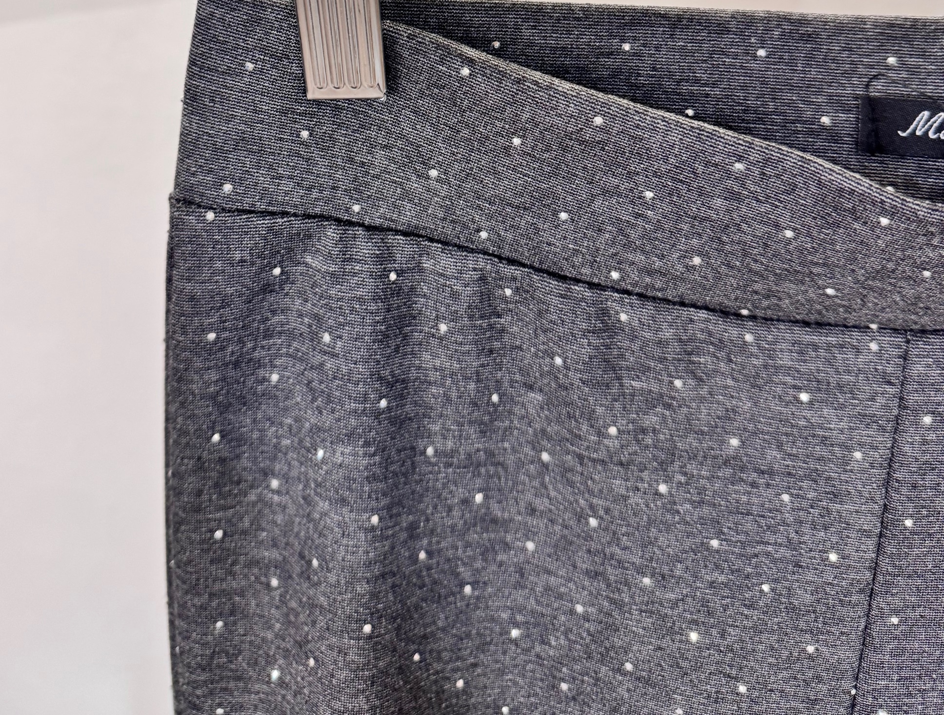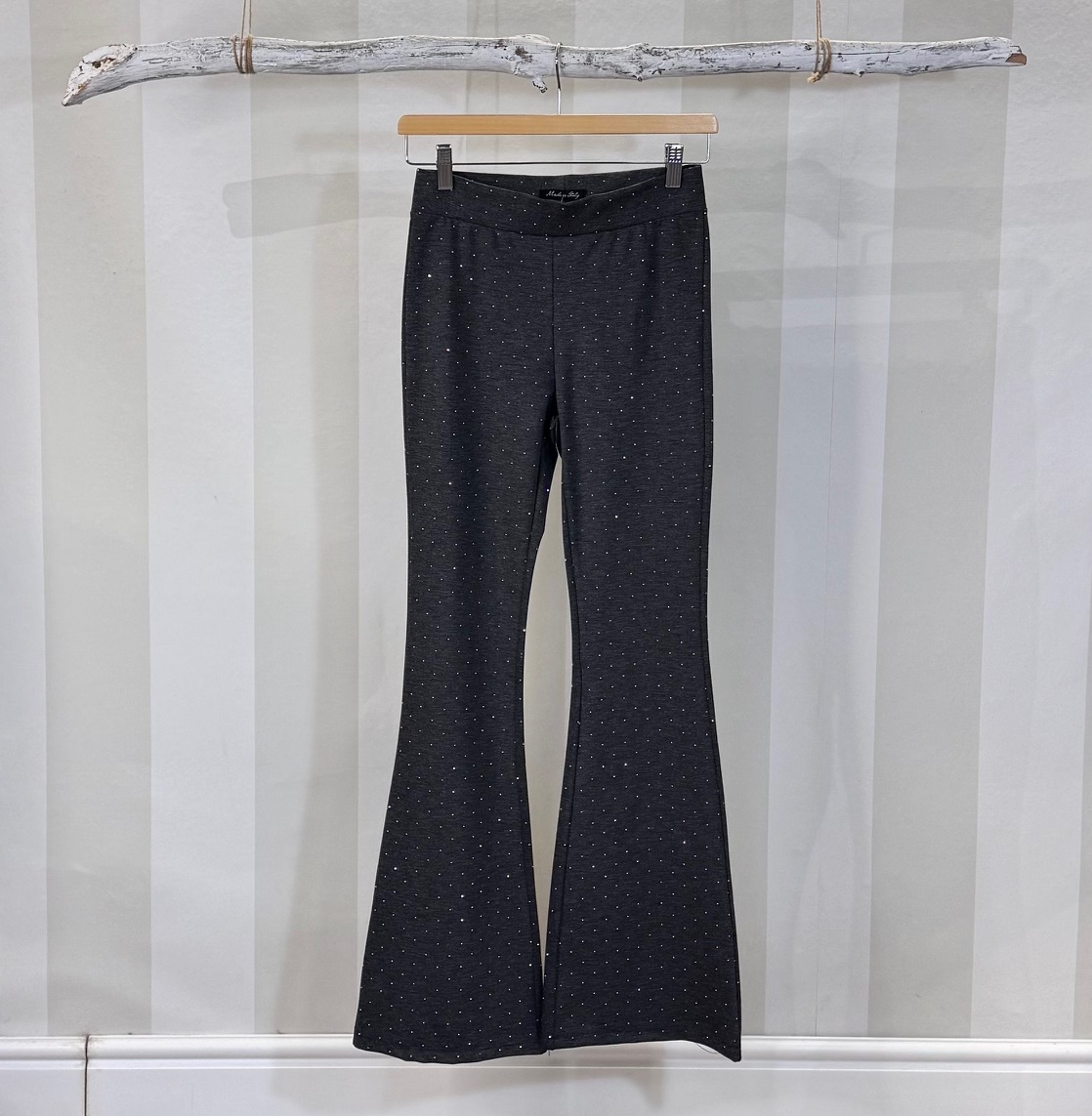 Pantalón ajustado y acampanado en la arte inferior. Brillantes blancos pequeños.