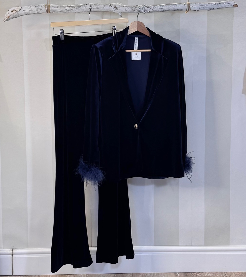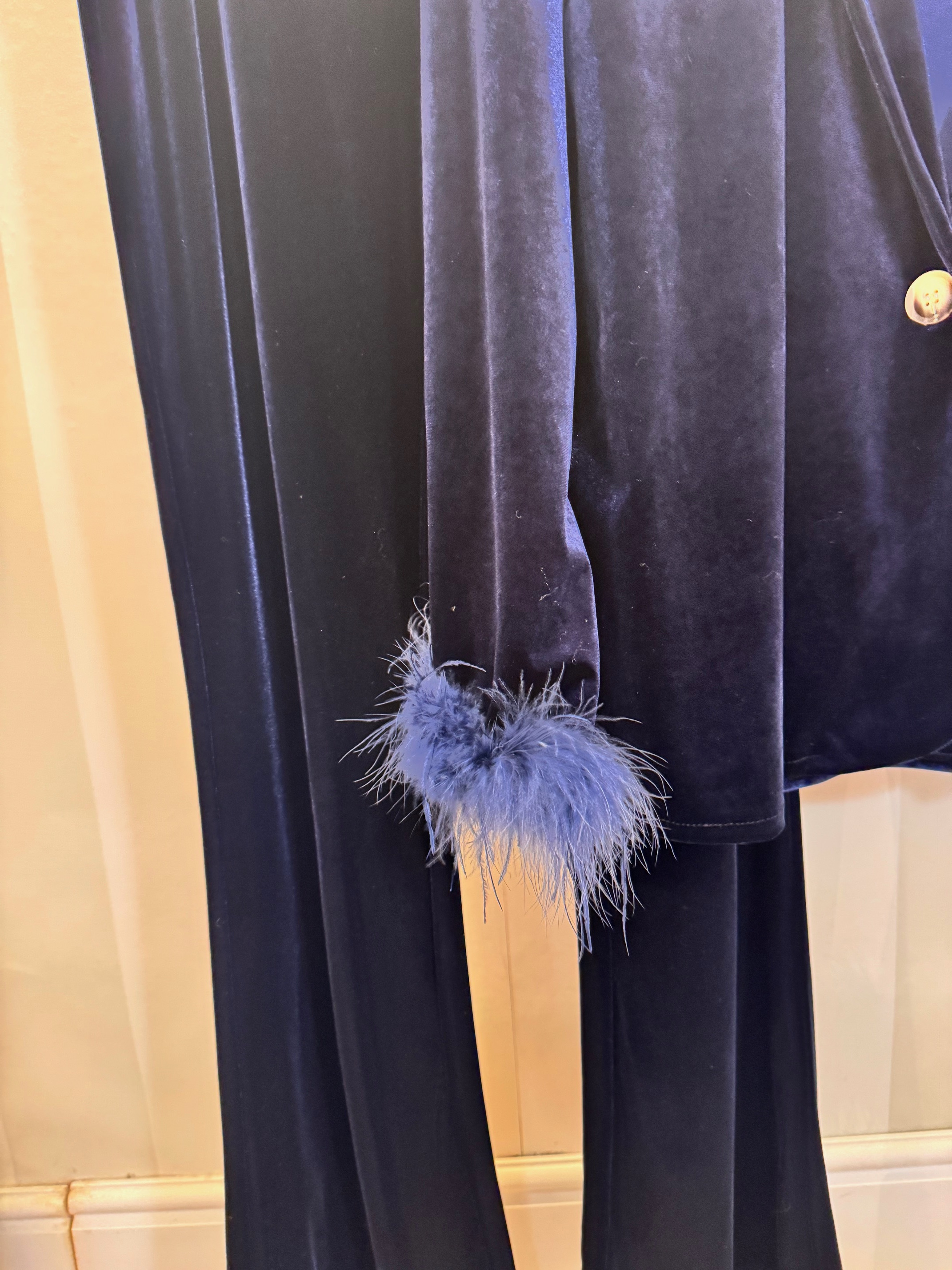 Conjunto de terciopelo azul marino formado por dos piezas. Blazer suelto con plumas en puños y pantalón flared. Talla única