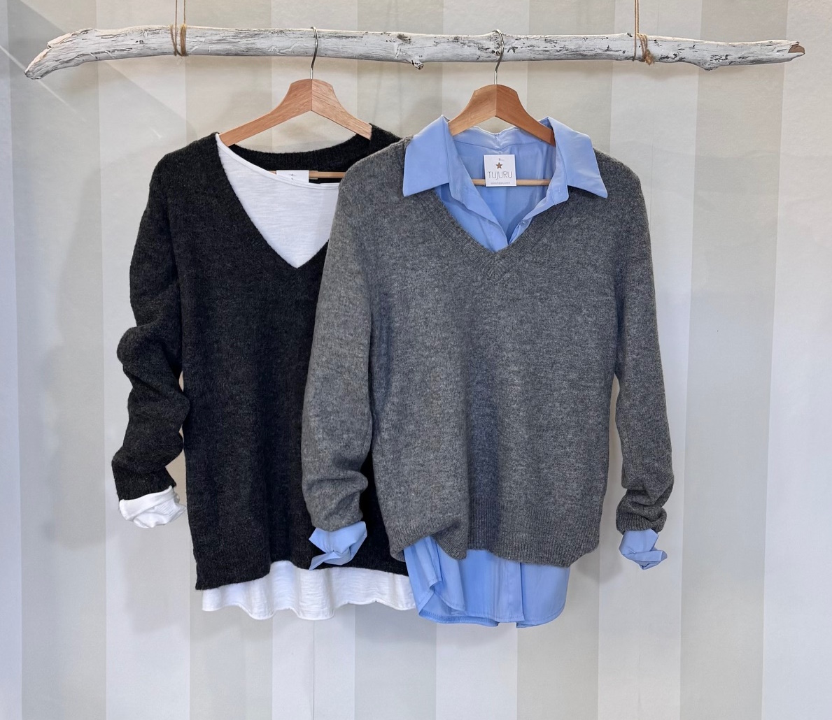 Jersey básico de punto con cuello pico. Tacto esponjoso y muy suave. Talla única
