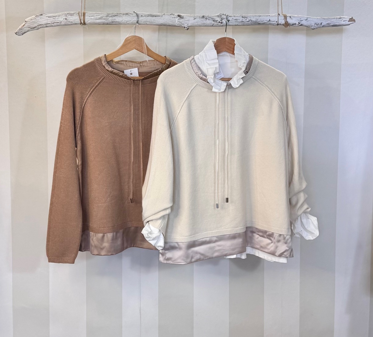 Jersey de grosor medio con doble cuello tipo raso y fladón del mismo género en la pasrte inferior.