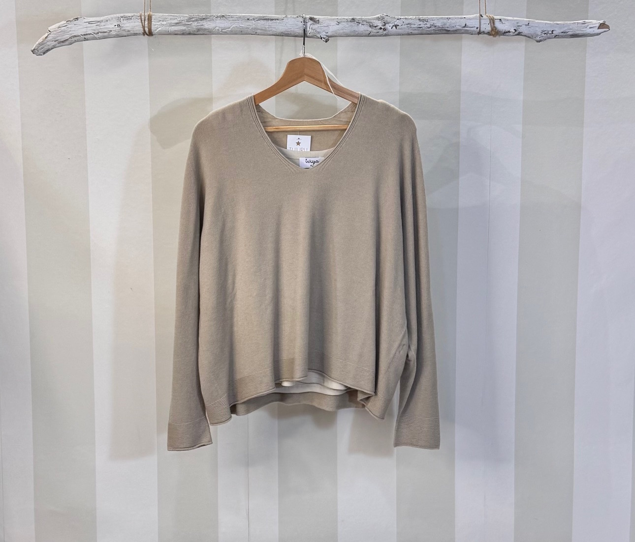 Jersey básico de punto con grosor medio fino. Cuello pico y tacto muy dulce. Parte interior y puños con rayas en relieve del mismo género. Talla única comleta.