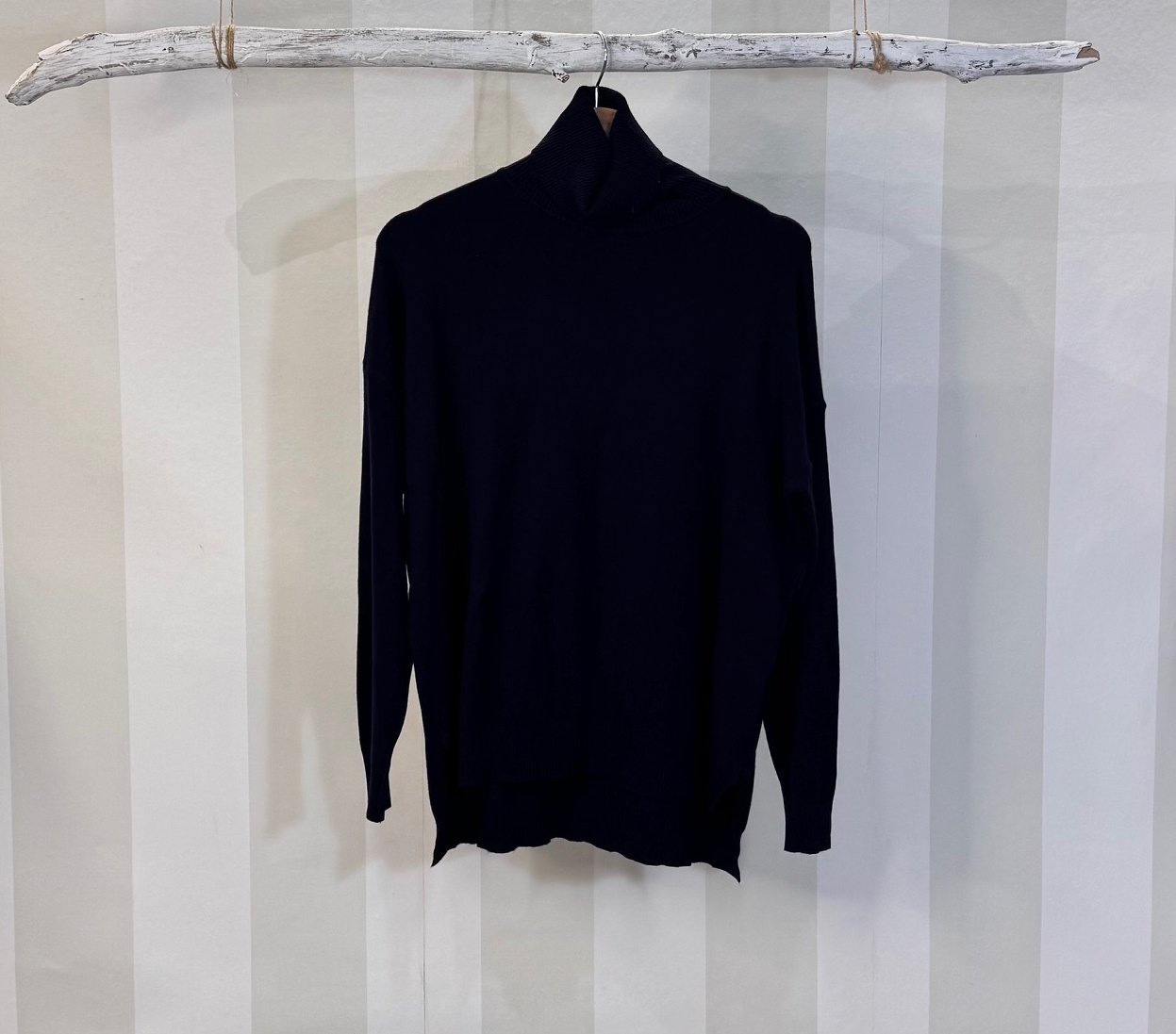 Jersey de punto fino con cuello alto. Más largo por la parte trasera. Talla única completa.