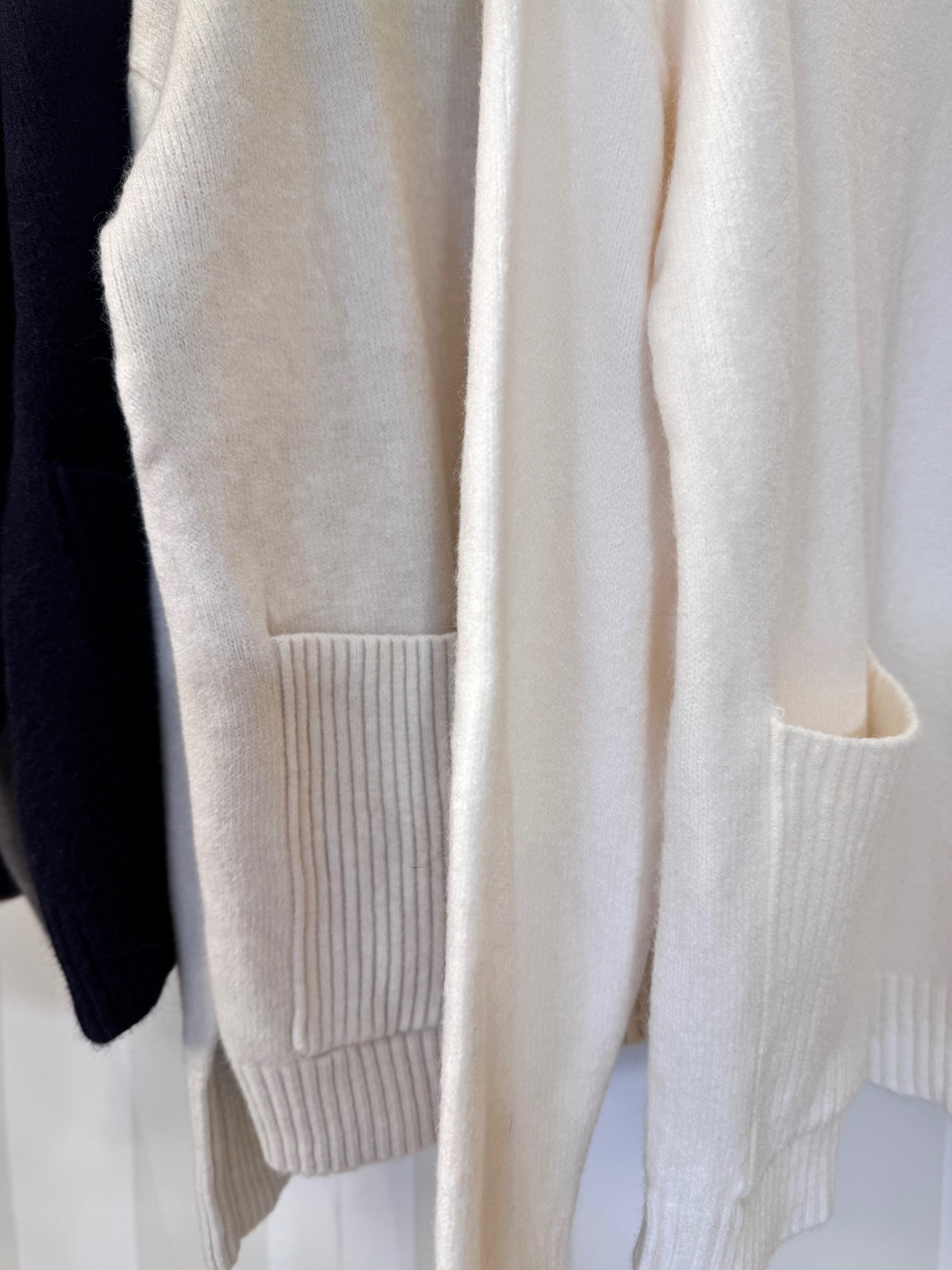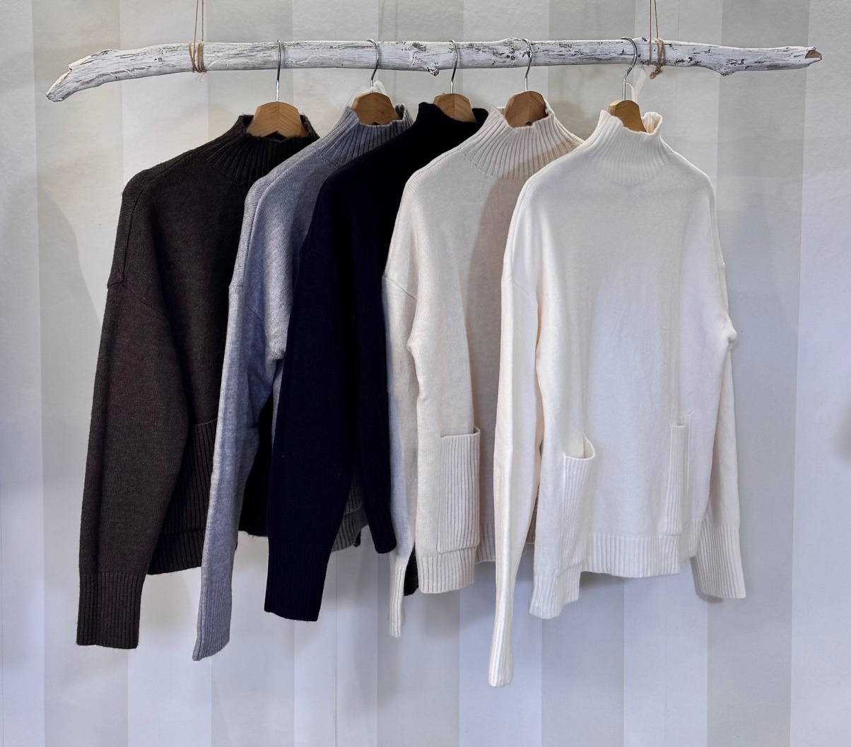 Jersey de cuello perkins con bolsillos. Cuello y bolsillos rayados del mismo género. Talla única.