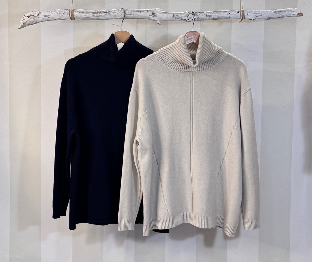 Jersey básico maxi de punto con tacto muy agradable. Talla única oversize. Cuello alto caído que no aprieta. Modelo largo.