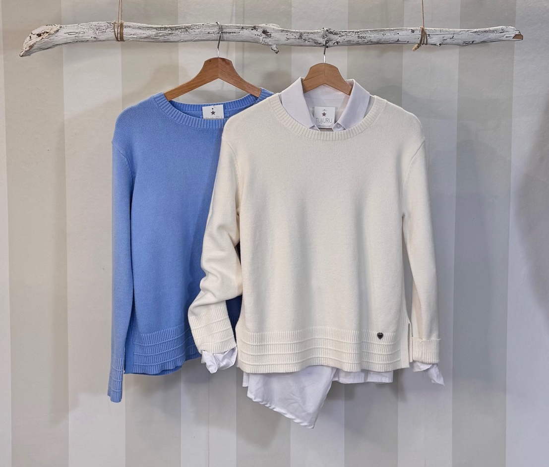 Jersey básico de cuello redondo con rayas en relieve en puños y parte inferior. Tejido de grosor medio.