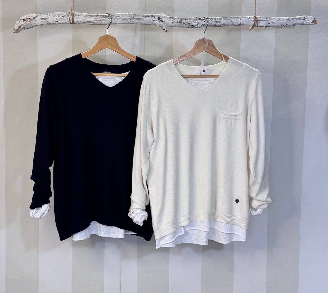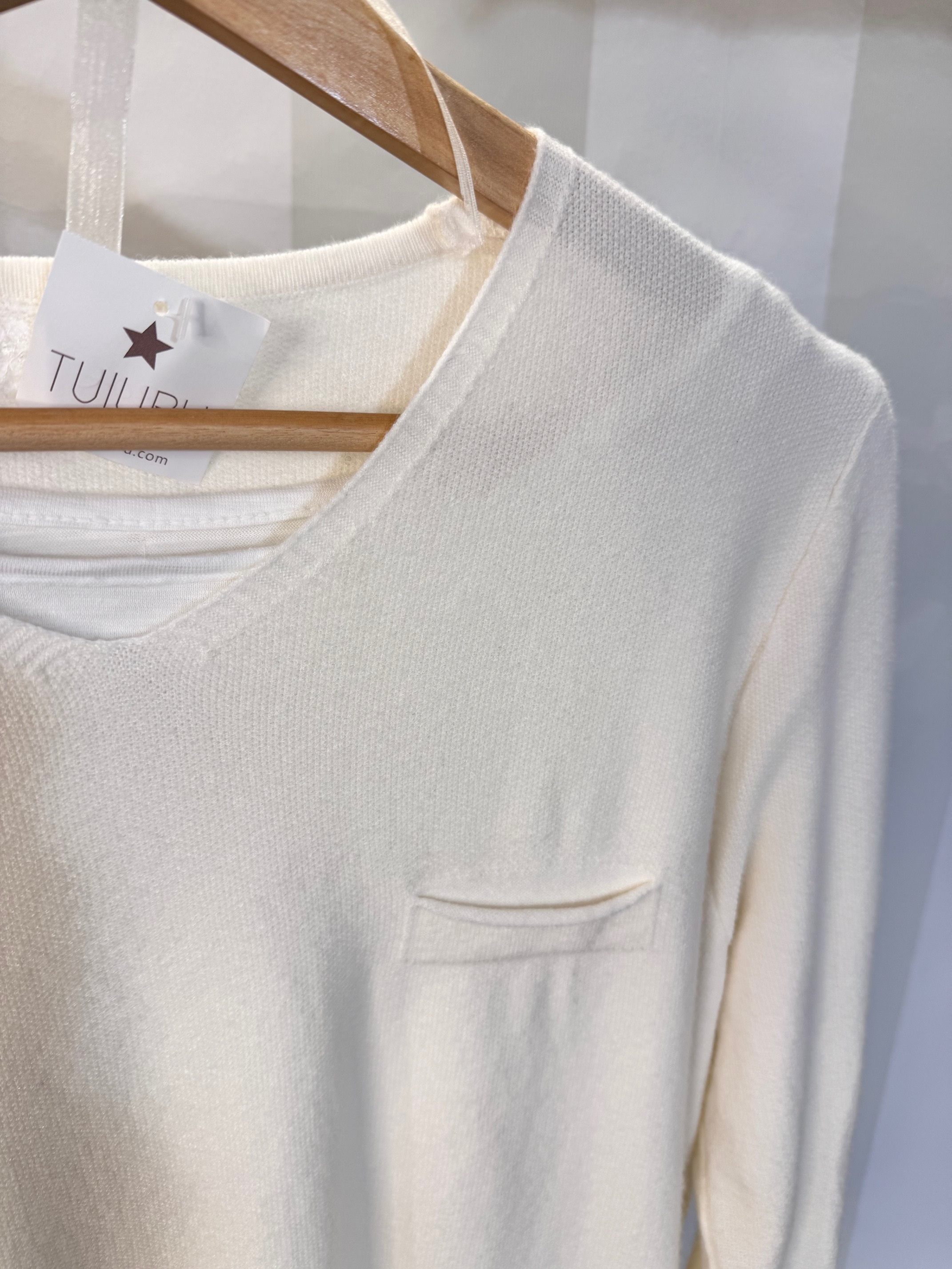 Jersey básico con cuello pico y falso bolsillo. Género no muy grueso. Talla única.