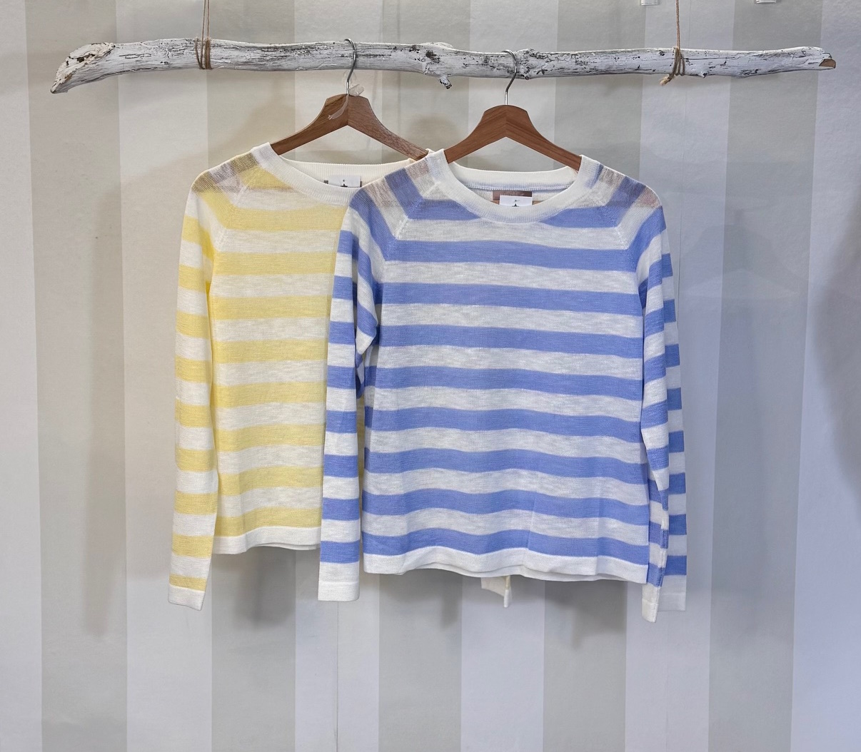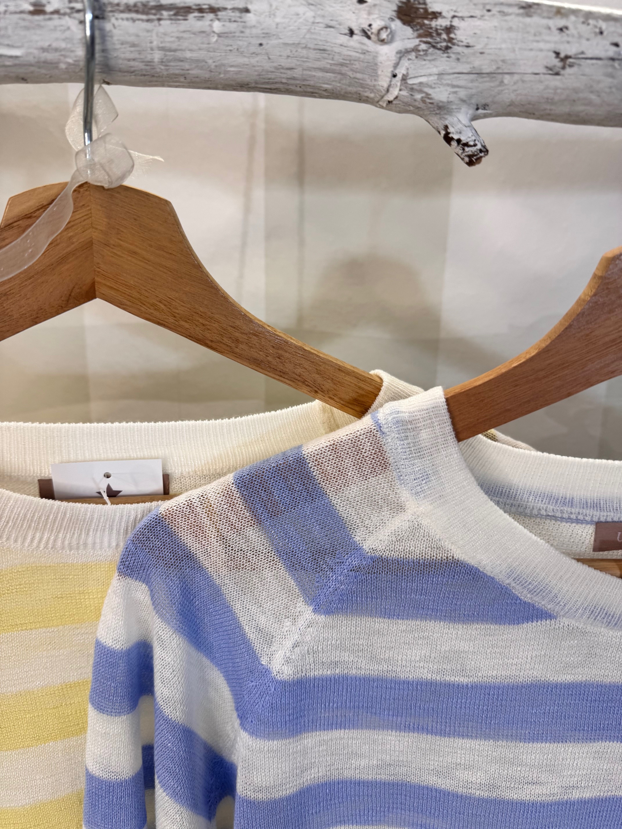 Jersey fino de rayas con cuello redondo. Tejido que clarea un poco, es mejor llevar una básica debajo.