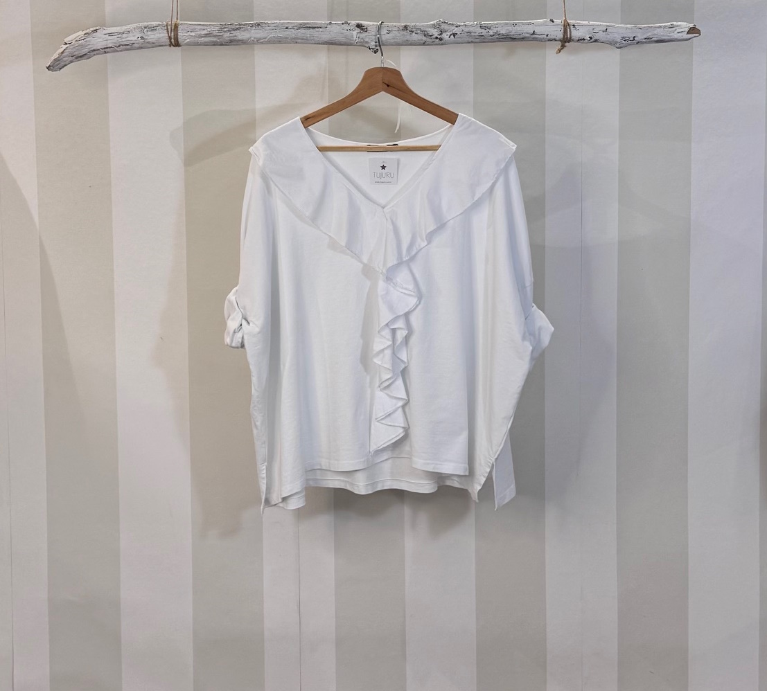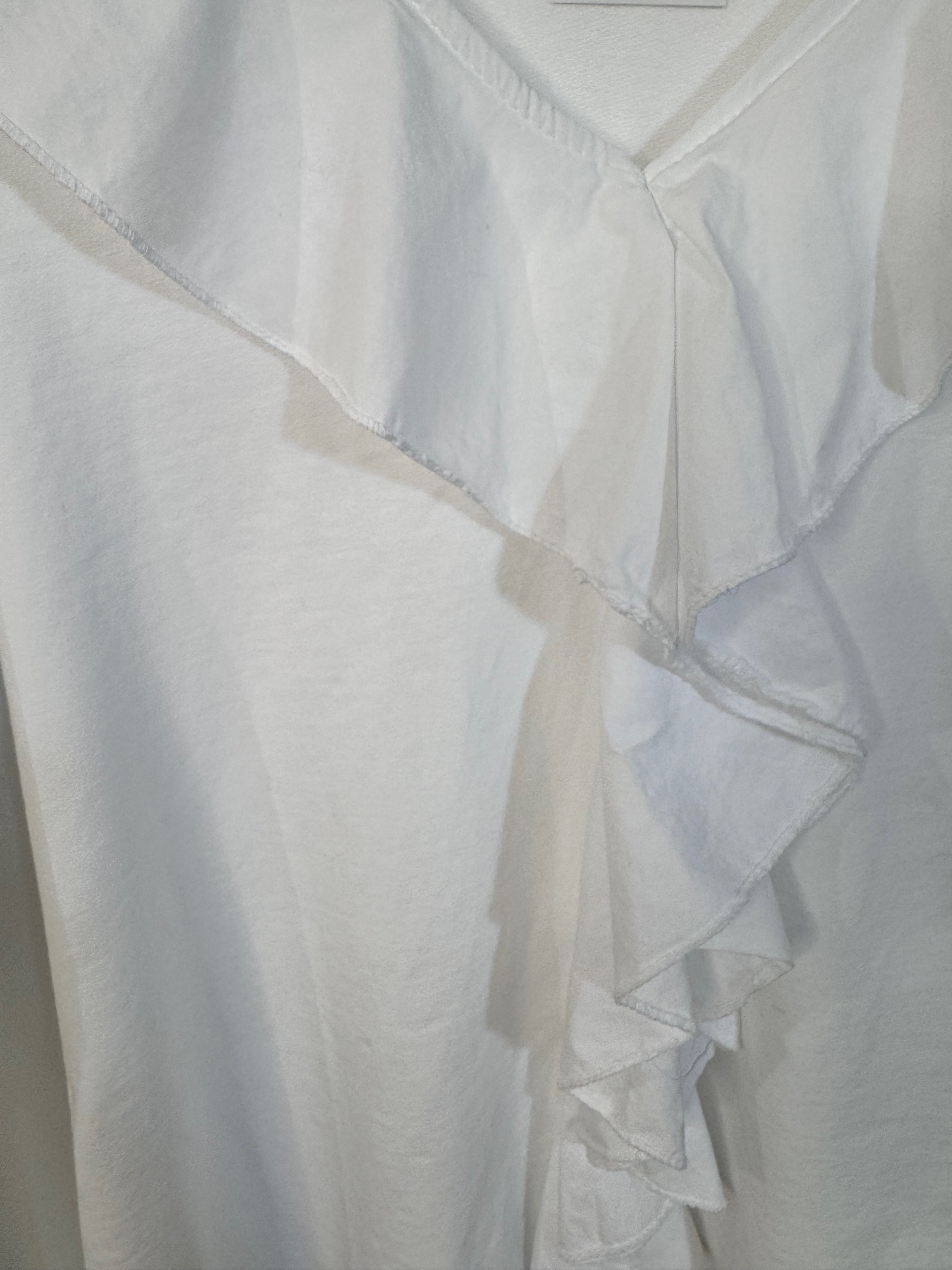 Sudadera fina de algodón, con cuello pico y volante. Talla única completa.