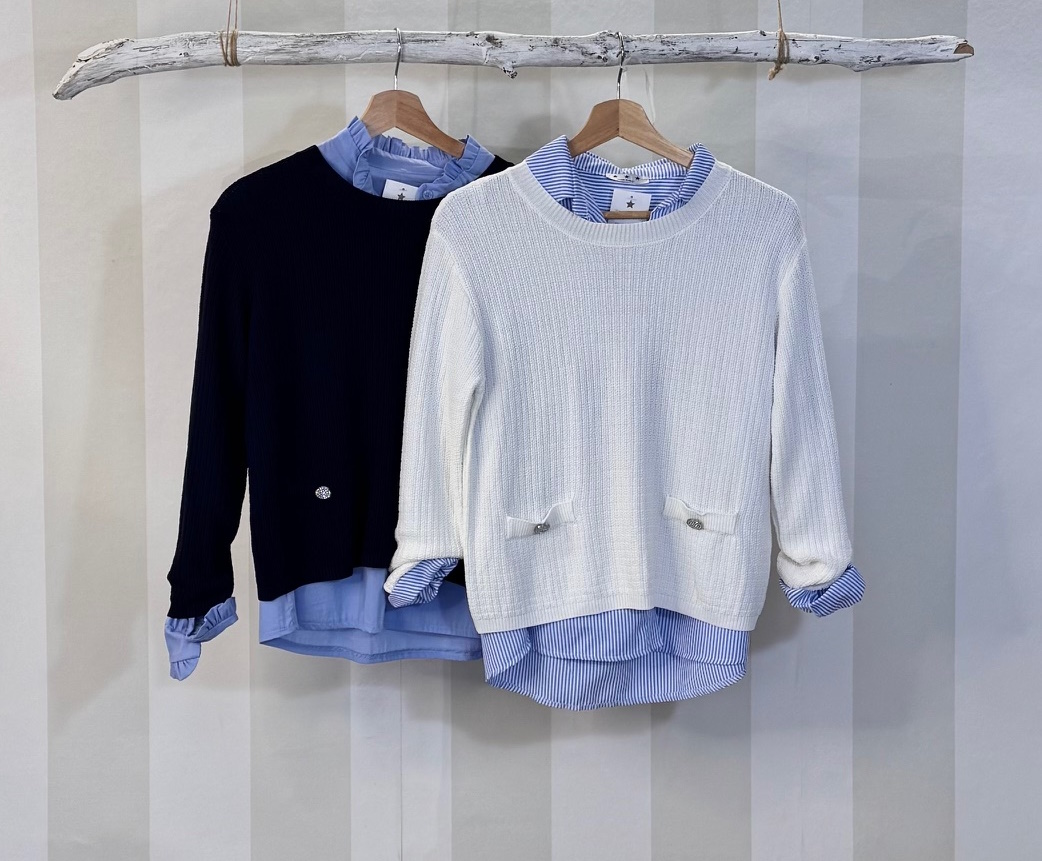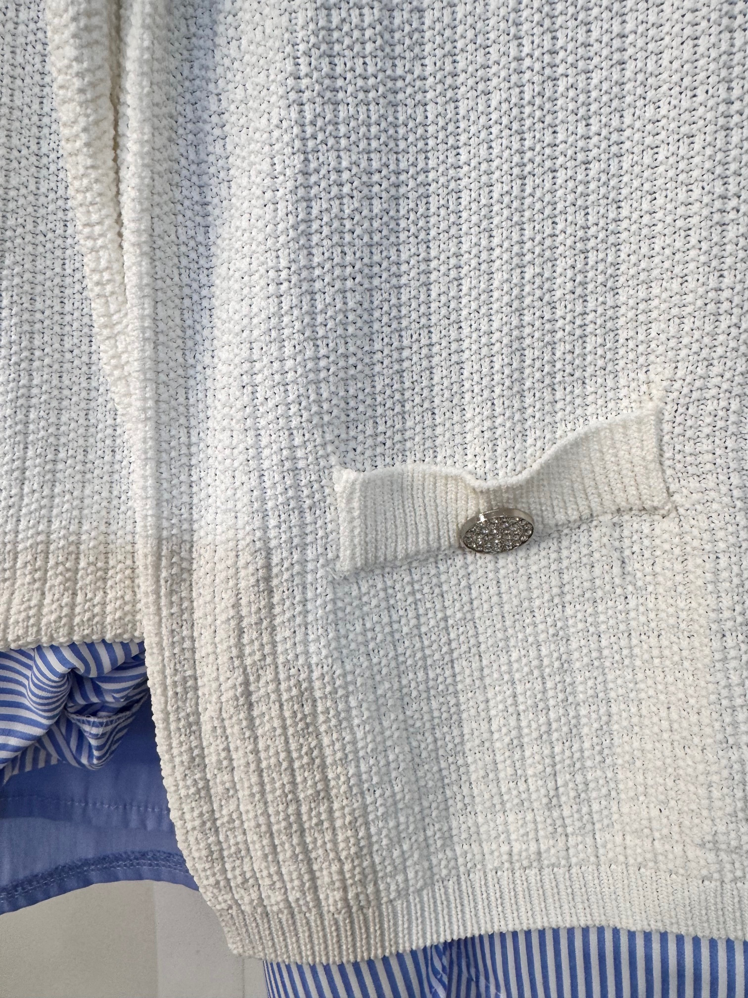 Jersey de punto frío con falsos bolsillos. El propio género hace una cuadricula. Grosor medio.