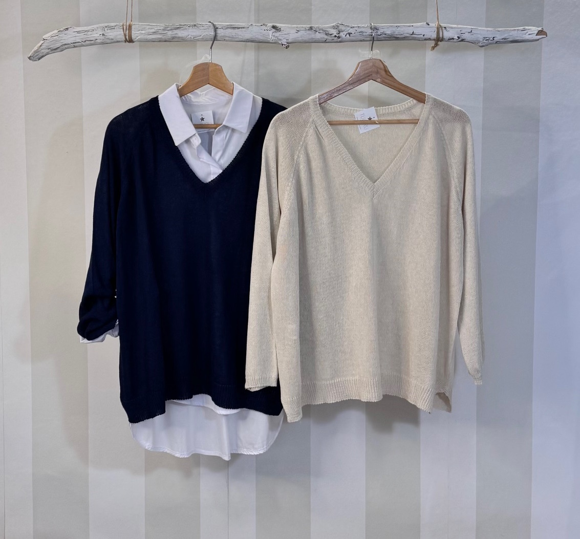 Jersey básico de punto con cuello pico. Talla única completa, ideal si lo buscas un poco más ancho y largo.