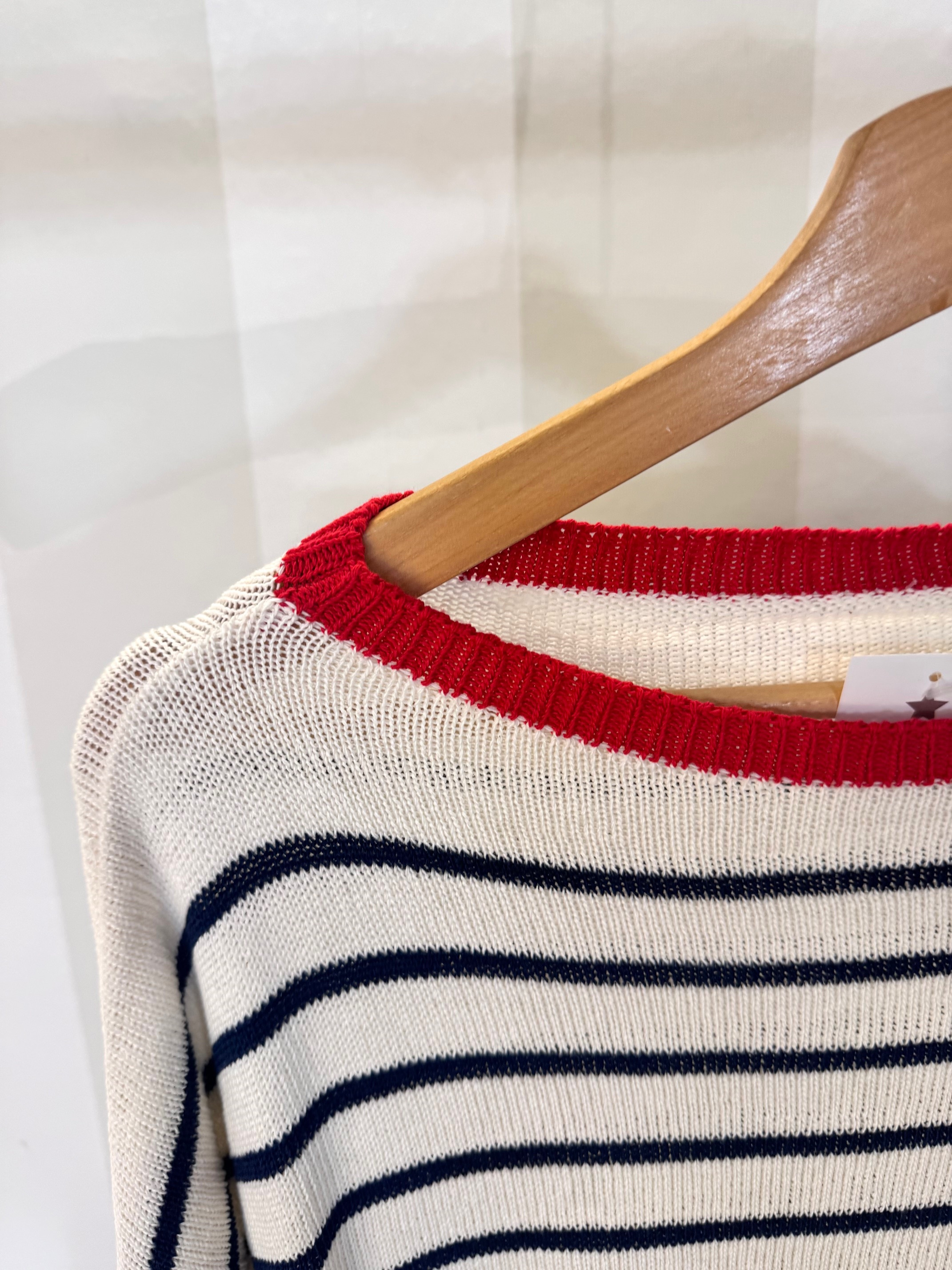 Jersey crudo con rayas rojas y azul marino. Talla única, modelo ancho pero no muy largo.
